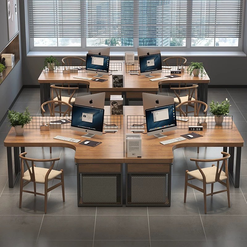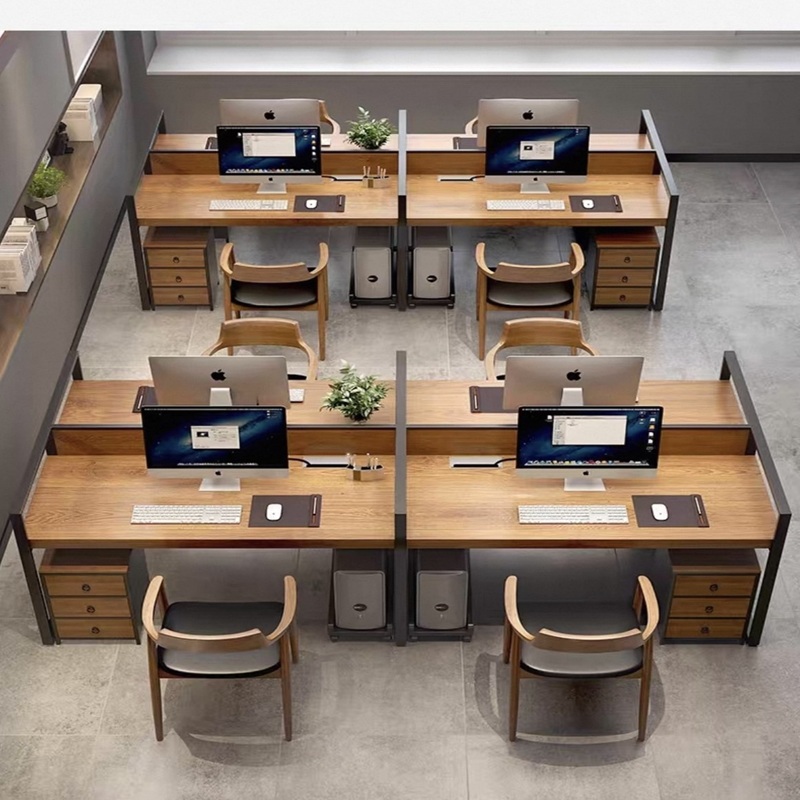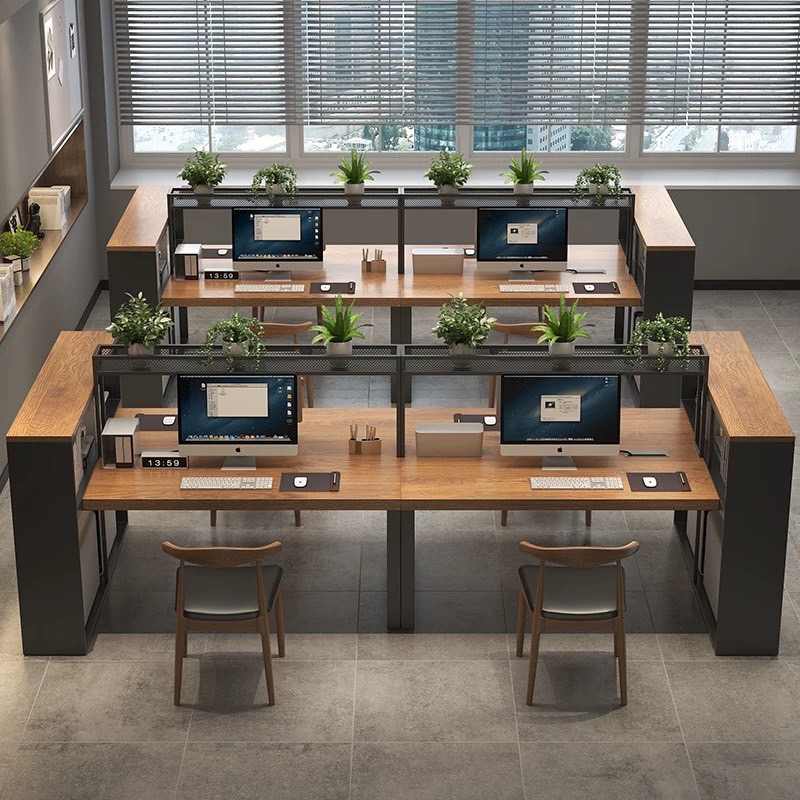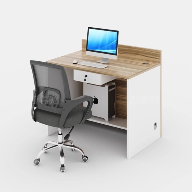 Employee desks have desk dividers. With plug + side cabinet I0031